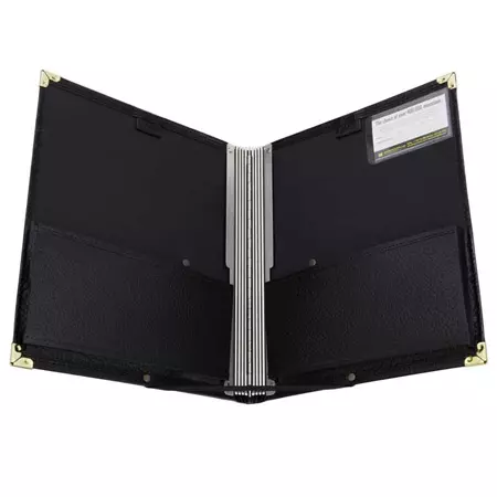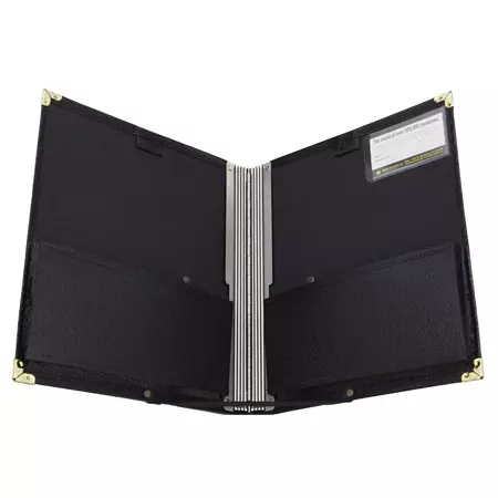 Schwarzes Lederimitat mit messingfarbenen Ecken, stabiles Aluminiumgelenk mit 10 Kordelzügen zum Befestigen von Notenheften, Rückengurt zum sicheren Halten mit einer Hand, der Bodengurt ist fest vernietet und nicht abnehmbar. Er hält die Mappe in einem definierten Winkel offen, es ist aber kein vollständiges Aufschlagen möglich!