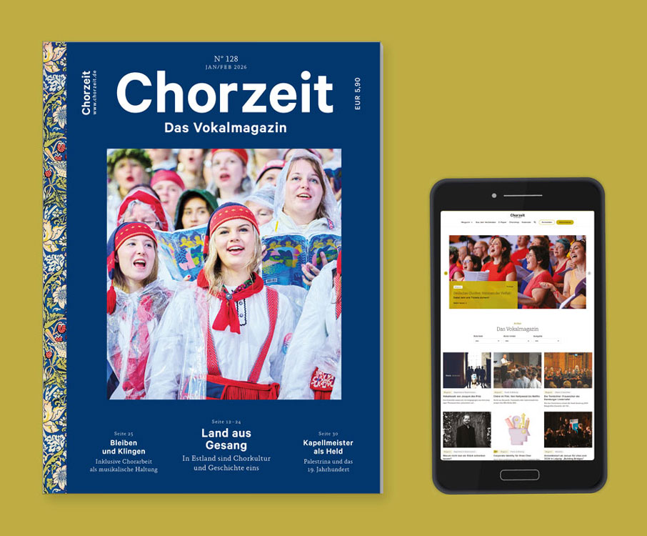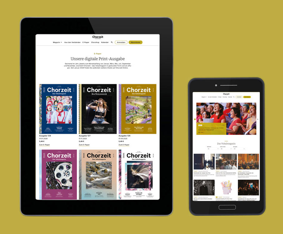 Mit Berichten, Nachrichten, Tipps, Terminen und Unterhaltsamem aus der Welt der Vokalmusik informiert die Chorzeit Sie wöchentlich hier auf Chorzeit Online. Sechsmal im Jahr schicken wir Ihnen das Magazin bequem nach Hause — oder Sie laden es sich als E‑Paper auf Ihren Desktop, Ihr Tablet oder das Handy und haben die Chorzeit jederzeit dabei.